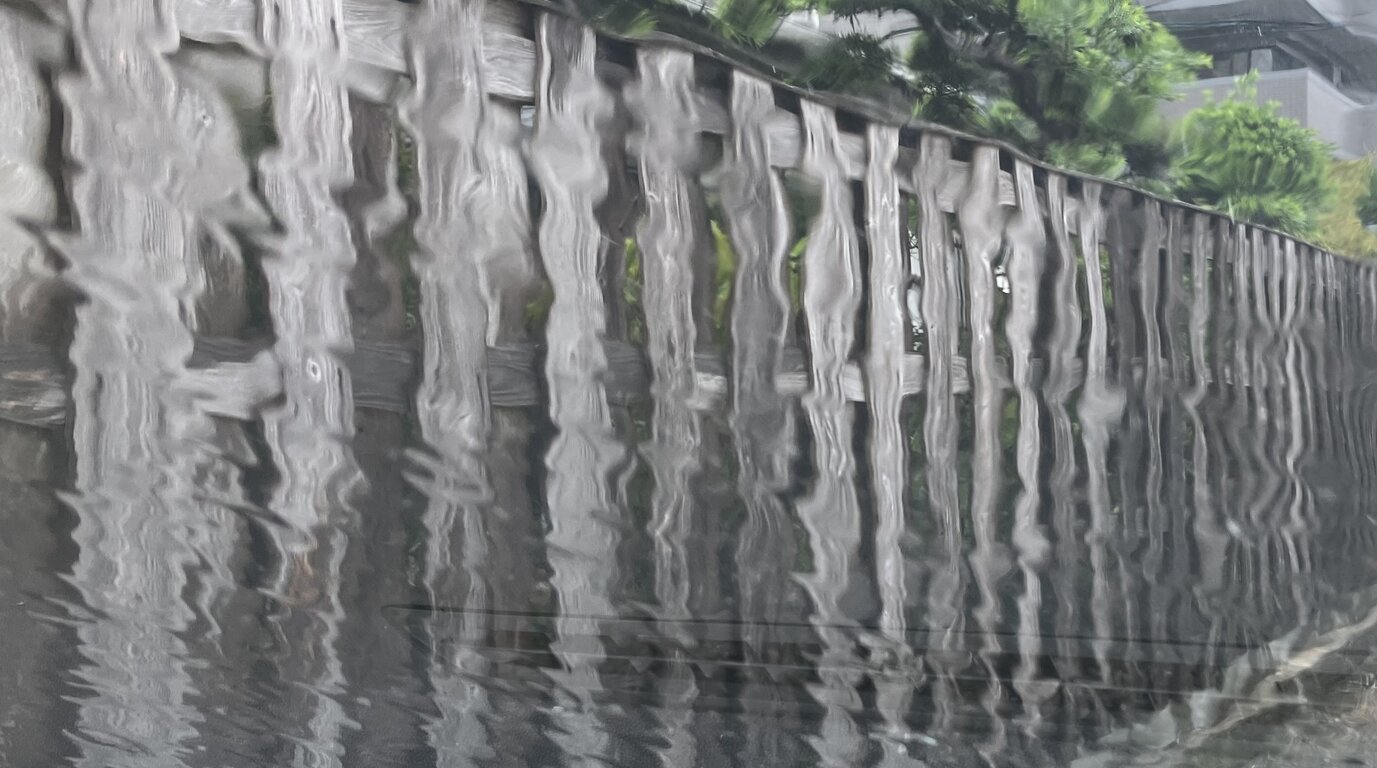 雨粒で濡れたフロントウィンドー越しに、隣家の板塀が歪んで現代アート風?に見えたので、パチリ。